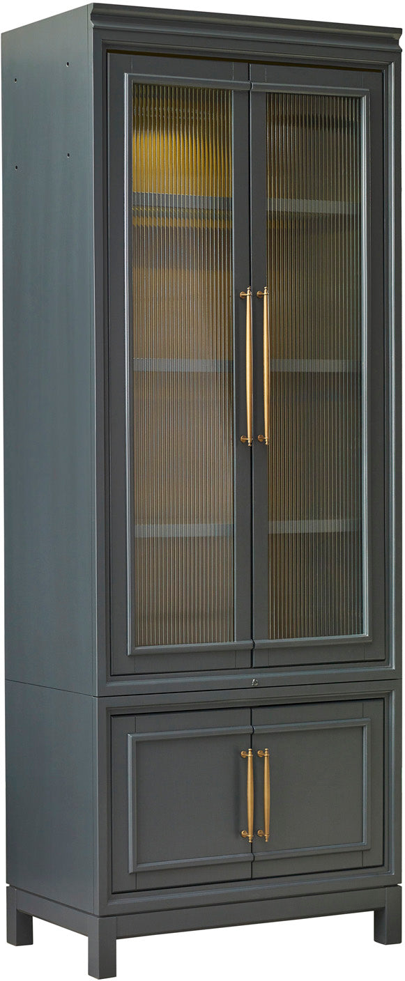 The Abigail Bookshelf features a refined midnight navy finish complemented by burnished bronze pulls, offering a timeless appeal. Its fluted glass cabinet doors add an elegant texture while three levels of lighting, controlled by a discreet touch switch, create the perfect ambiance. Adjustable interior shelves provide versatile storage options, making this piece both beautiful and functional for sophisticated living spaces.